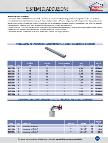 103SISTEMI DI ADDUZIONERaccordi al carbonioI raccordi in PRESS CARBON sono i raccordi a pressare in acciaio al carbonio disponibili sia con profilo M che con profilo V.Sono dotati di due sistemi di sicurezza quali il sistema brevettato LBP con o-ring poligonale che permette il gocciolamento del raccordo se non pressato, e il sistema SLEEVE che con la sua fascetta rossa sul profilo di pressatura che si %u201cstraccia%u201d quando viene pressata, garantisce un %u201cindicatore visivo%u201d di pressatura (o mancata pressatura).Prodotti in Italia, i raccordi consentono la realizzazione di impianti in modo rapido ed economico sono la soluzione ideale soprattutto per impianti di riscaldamento e raffrescamento in circuito chiuso.I raccordi in acciaio al carbonio NON sono idonei per l%u2019utilizzo con acqua potabile.TUBI ACCIAIO AL CARBONIO SECONDO EN 10305-3, ZINCATURA ESTERNA 8 MICRONCODICE CONF.%u00d8 ESTERNOmmSPESSOREmmLUNGHEZZA BARRAmPESOkg/m U.M.PREZZO%u20ac0329554%u25cf6151,260,408MTrichiesta0329555%u25cf6181,260,497MTrichiesta0329556%u25cf6221,560,758MTrichiesta0329557%u25cf6281,560,98MTrichiesta0329558%u25cf6351,561,239MTrichiesta0329559%u25cf6421,561,498MTrichiesta0329560%u25cf6541,561,942MTrichiesta0329561%u25cf676,1263,655MTrichiesta0329562%u25cf688,9264,286MTrichiesta0329563%u25cf6108265,228MTrichiestaRACCORDO A PRESSARE CURVO 90%u00b0 FILETTO F PER TUBO ACCIAIO AL CARBONIOCODICE CONF. DESCRIZIONEPROFILO MISURA U.M.PREZZO%u20ac0329595%u25cf10raccordo curvo filetto FV15 x 1/2%u201dNR17,540329596%u25cf10raccordo curvo filetto FV18 x 1/2%u201dNR19,040329597%u25cf10raccordo curvo filetto FV22 x 3/4%u201dNR23,45Per tutte le schede tecniche e dichiarazioni di conformit%u00e0: www.divisionenergy.com/prodotti/